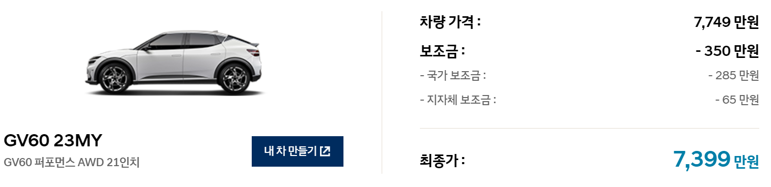 제네시스GV 60은 시작 가격이 6839만원 이기 때문에 보조금 50% 구간으로 최대 325만원을 보조금으로 받을 수 있습니다. 스탠다드 후륜구동 19인치 기준이고 퍼포먼스 21인치 트림을 올리게 되면 최소285만원을 보조금으로 받을 수 있게 됩니다.